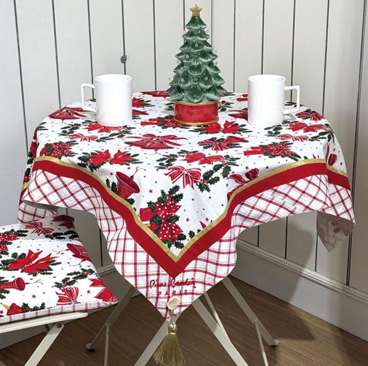 Realizzato al 100% in cotone di alta qualità e lavorato a mano, questo raffinato centrotavola misura 90x90 cm ed è impreziosito da un bordo decorativo e delicate nappine, che aggiungono un tocco di classe e calore al tuo ambiente natalizio.