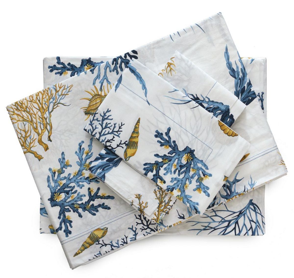 Il design a tema marino, con stampa elegante di coralli, conchiglie e piccoli pesciolini, porta allegria e stile alla camera, evocando l’atmosfera del mare in ogni dettaglio. I volani delle federe aggiungono un tocco raffinato e sartoriale, rendendo il completo non solo funzionale ma anche decorativo.