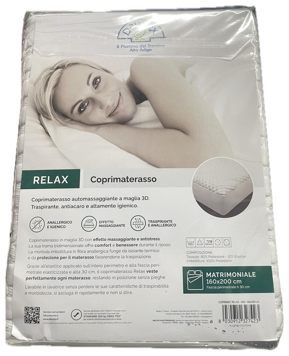 Il Coprimaterasso Matrimoniale Daunex Art. Relax è progettato per migliorare il comfort del riposo e proteggere il materasso in modo efficace e duraturo. La speciale struttura a maglia 3D automassaggiante favorisce una piacevole sensazione di benessere, stimolando la microcircolazione durante il sonno.