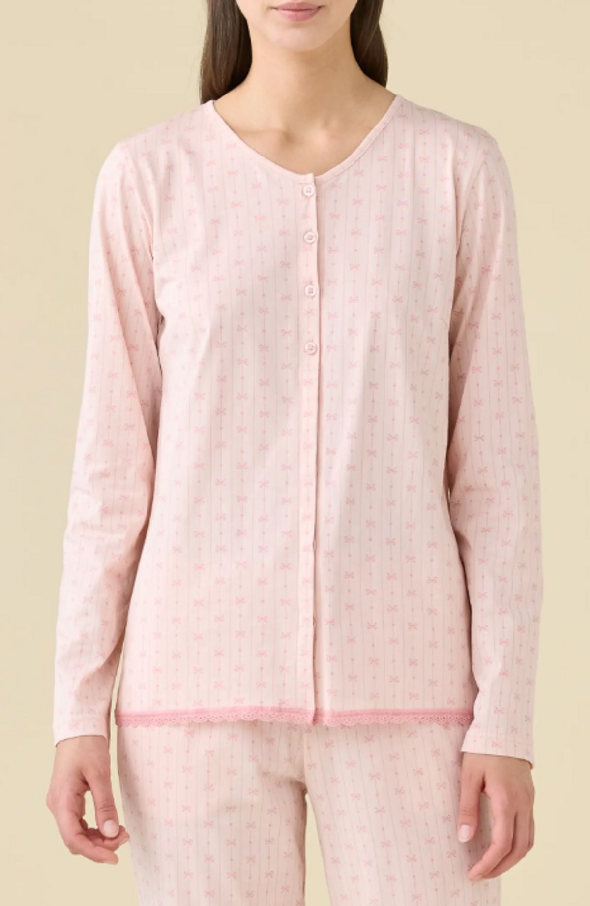 Il completo è composto da maglia a manica lunga dal design semplice e femminile, abbinata a pantalone lungo senza polsini, che assicura una vestibilità comoda e naturale. La linea pratica e confortevole rende questo pigiama perfetto sia per dormire sia per rilassarsi in casa.