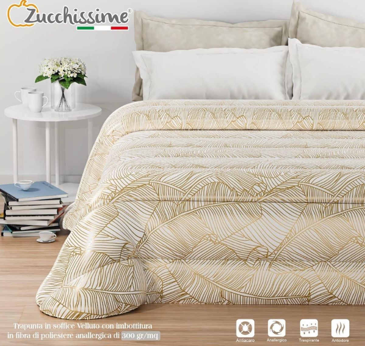 Velluto esterno soffice e pregiato, per un effetto visivo e tattile elegante e accogliente Imbottitura in fibra di poliestere anallergica da 300 gr/m², calda ma leggera Antiacaro, anallergica, traspirante e antiodore, perfetta anche per chi soffre di allergie Grande formato 260x260 cm, ideale per letti matrimoniali e king size Design esclusivo Zucchissime, per un tocco di personalità e raffinatezza nella tua camera